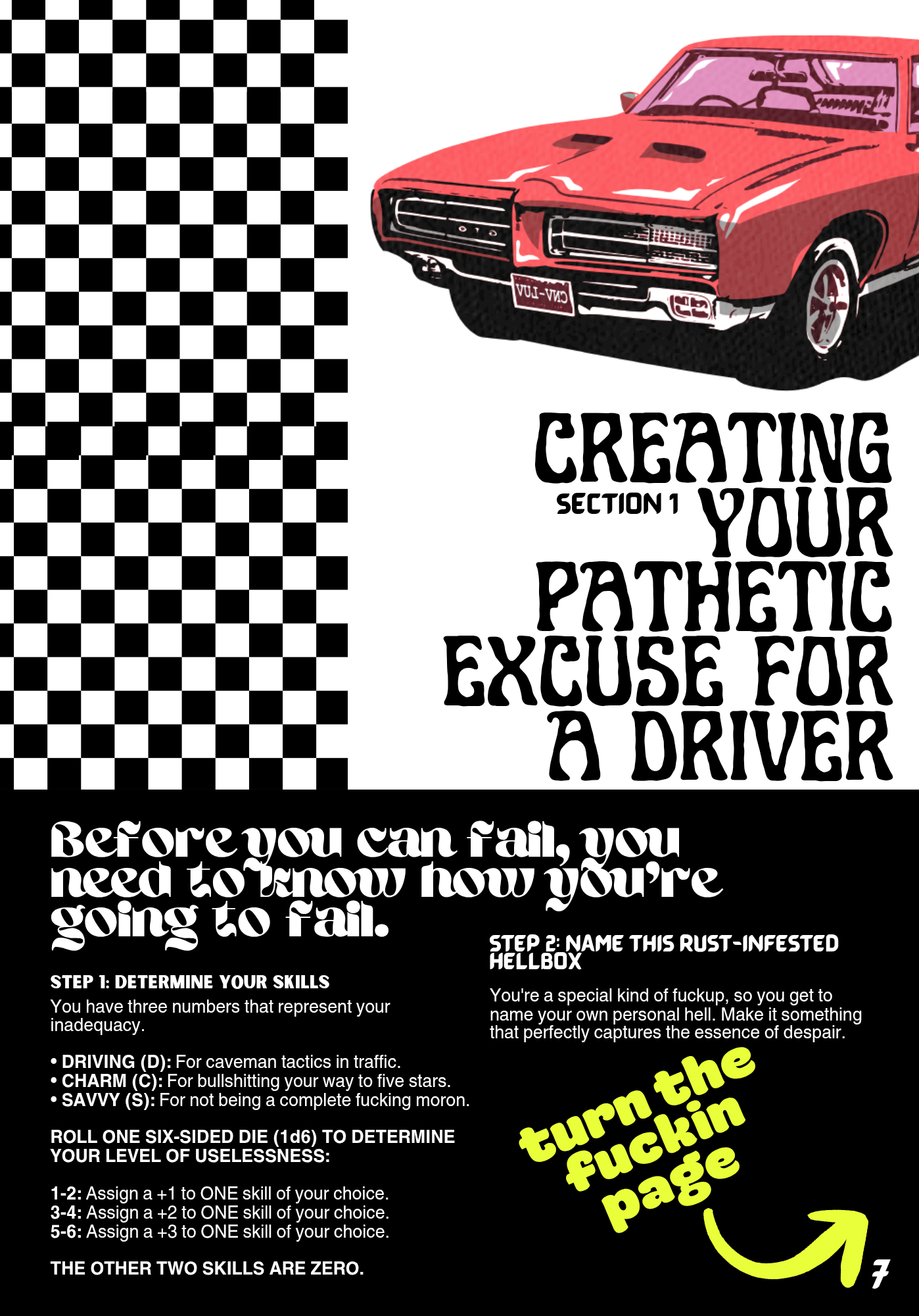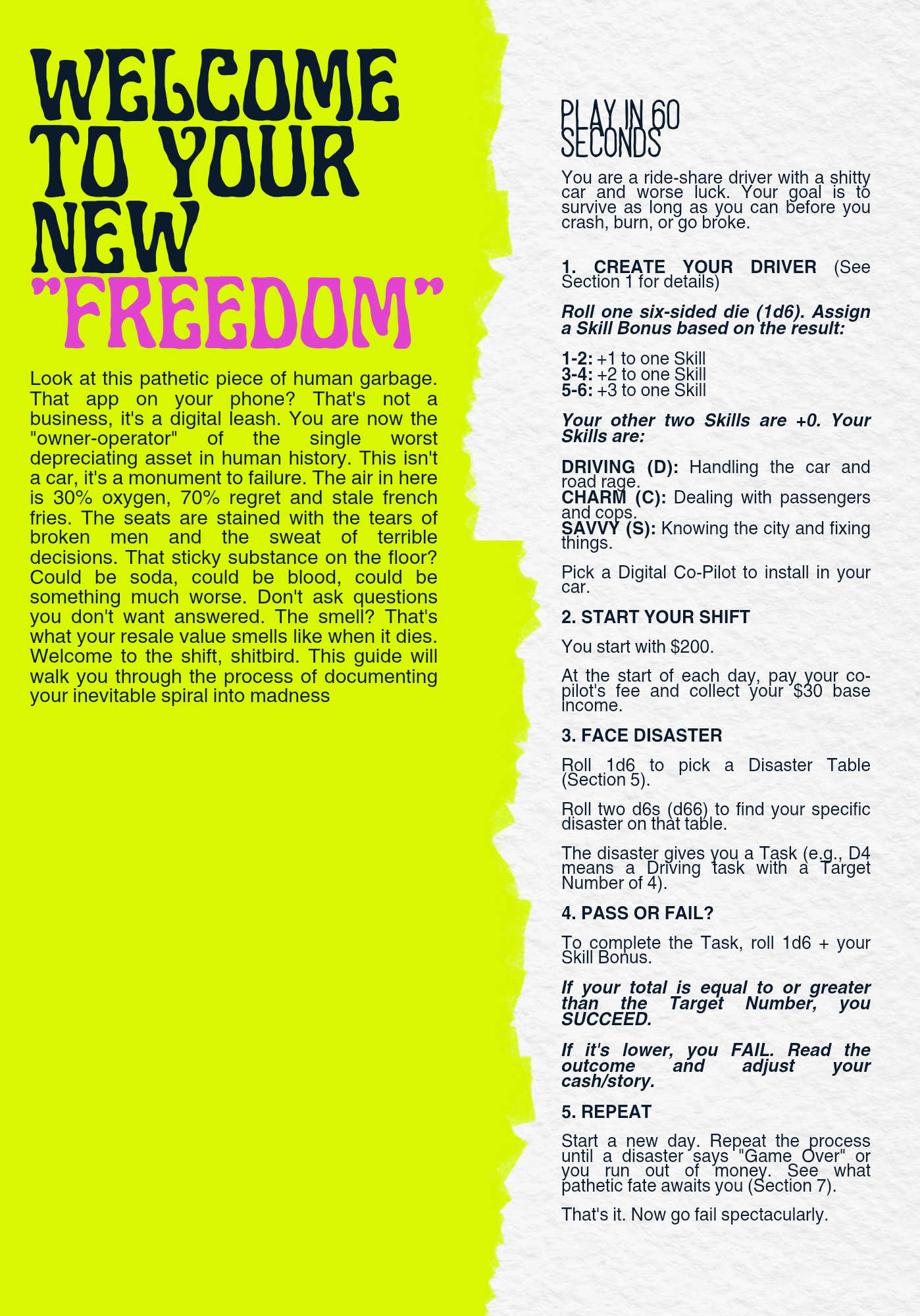 21 pages of bullshit. It's basically Taxi Driver if it was a rules-light solo RPG. It's about being a ride-share driver whose life is circling the drain. You just roll on d66 tables and watch your sanity crumble.